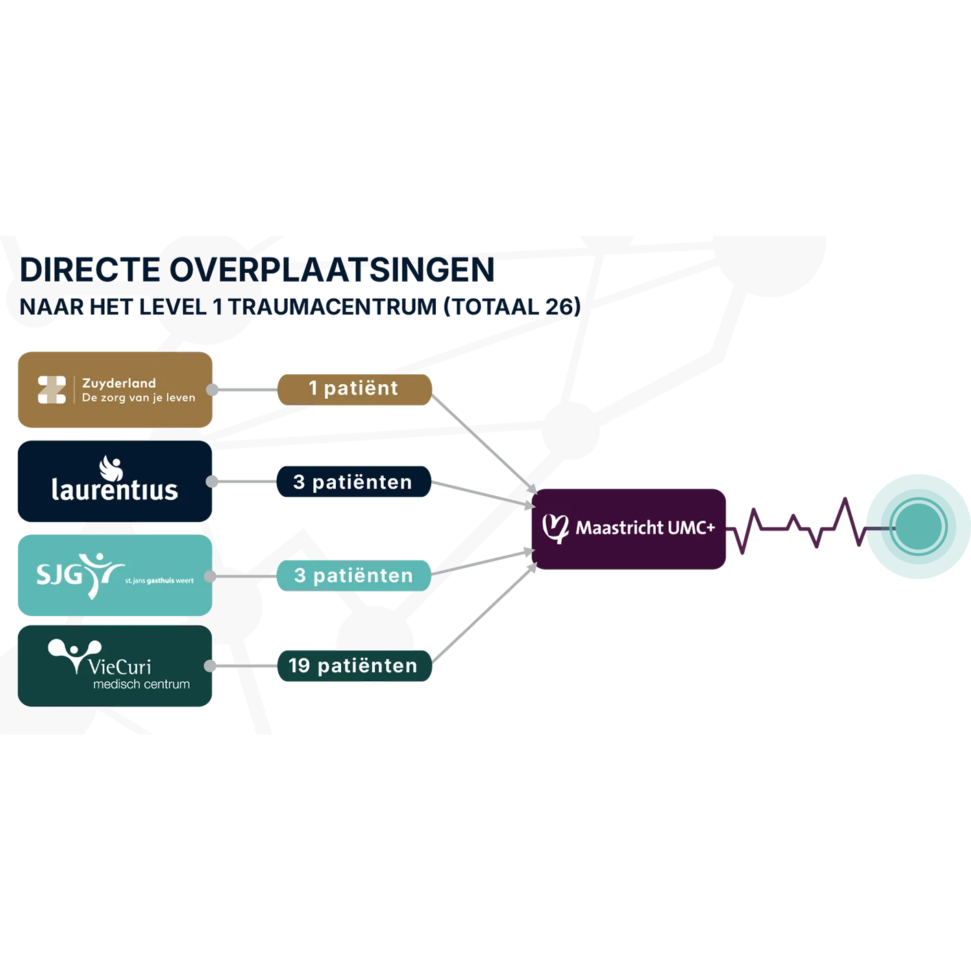 De cijfers over trauma en multitrauma in Limburg laten zien hoe NAZL het netwerk ondersteunt met data-analyse. In 2024 registreerden Maastricht UMC+ (1581), Zuyderland (1483), VieCuri (1208), Laurentius (818) en SGJ Weert (449) samen veel traumapatiënten, met een gemiddelde van 61% van de volumenorm. Deze inzichten helpen de regio om zorgprocessen te verbeteren.
